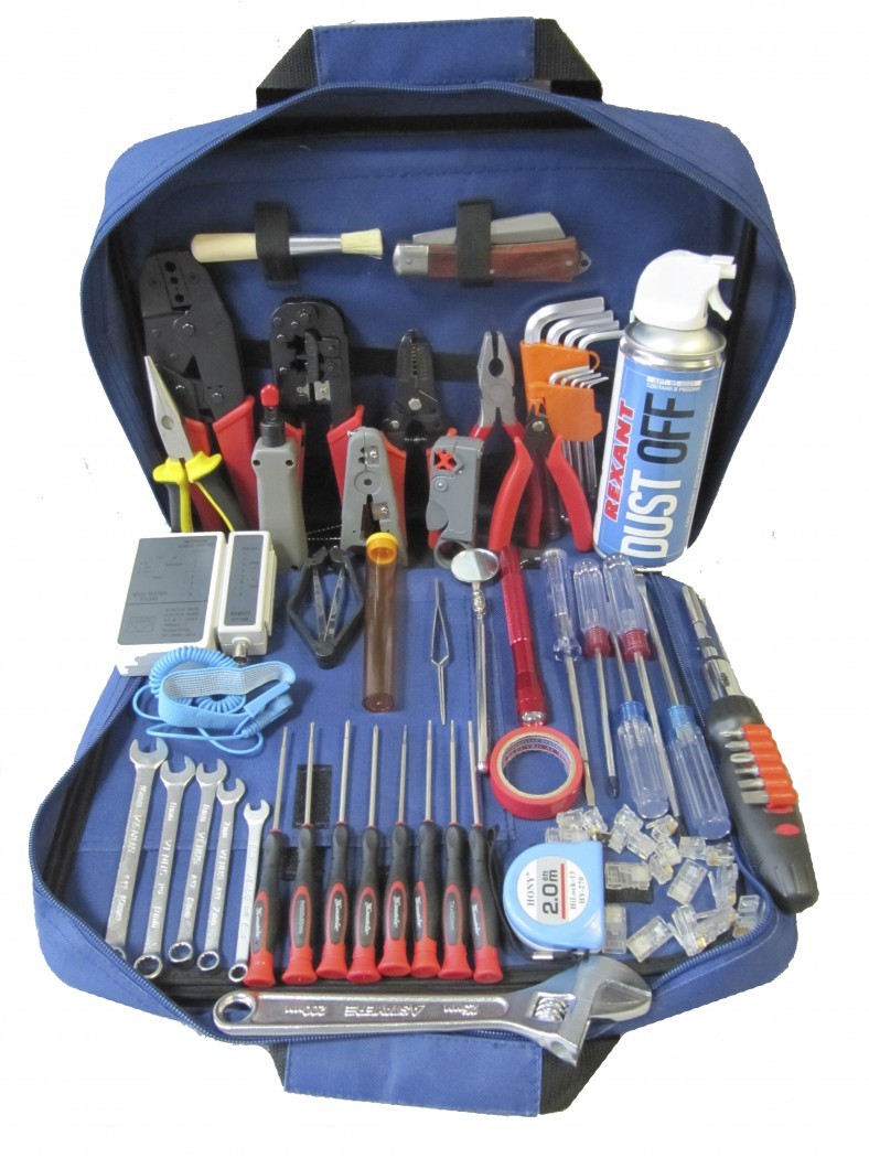 Инструменты для осмотра и ремонта компьютеров размещаются в удобной инструментальной сумке (или рюкзаке), выполненной из прочного материала. Все инструменты удобно размещаются в специальных карманах, что обеспечивает надёжное хранение и быстрый доступ к ним.