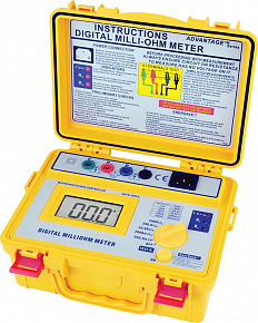 Цифровой измеритель сопротивления - миллиомметр 4137 mO: Измерение сопротивления шины заземления и контактов присоединения (± 0,5 %); 5 диапазонов, высокое разрешение (100 мкОм), 3 значения тестового ока (1 мА, 10 мА, 100 мА); Микропроцессорное управление; 4-х проводная схема измерения сопротивления; Питание 12 В (1,5 x 8); Автоудержание результата измерения, автовыключение питания; Предупреждение об опасном напряжении в цепи, защита от перегрузки; Индикация режимов и состояний прибора; Пылевлагозащищенное исполнение; Компактность, надёжность; Масса 1,5 кг.