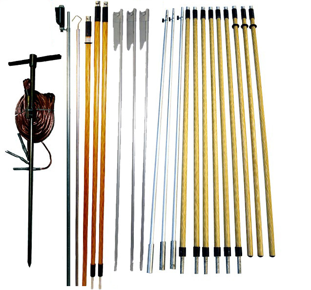 Для заземления проводов  в комплекте предусмотряны  три 5-и звенные заземляющие штанги с захватами.Каждая заземляющая штанга состоит из металлического звена с захватом , металлического звена, 2-х изолирующих звеньев и одного  изолирующего звена с рукояткой.
